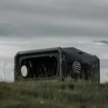 The lightweight capsule is engineered to be strong and durable, using a revolutionary inflatable frame that does not use any metal supports. It's backpack-sized for easy transportation and quick installation. It takes less than five minutes to inflate and turns any location into a space capsule. A luxurious and spacious sanctuary.