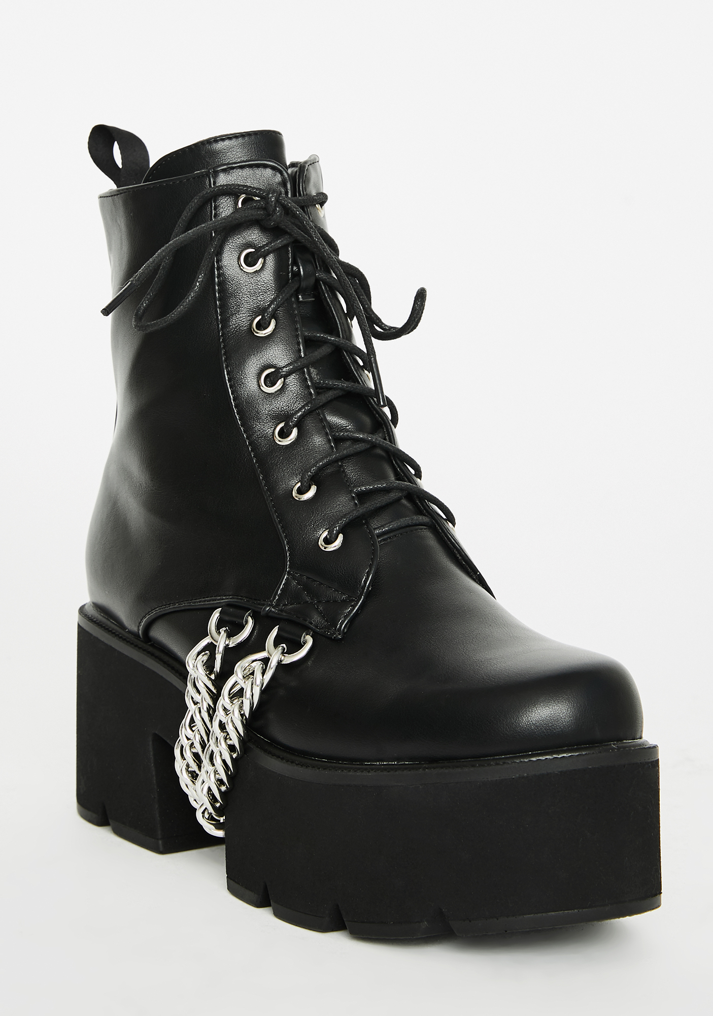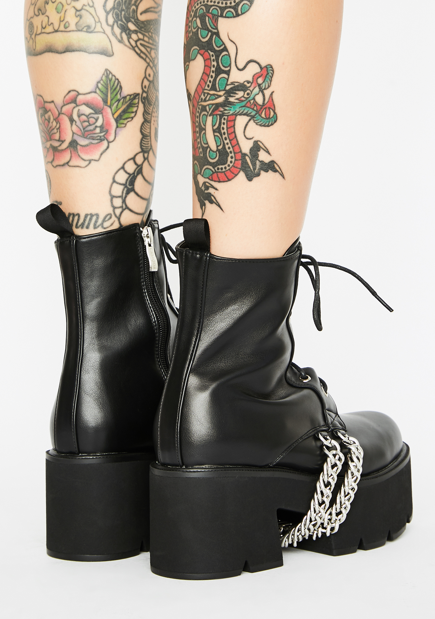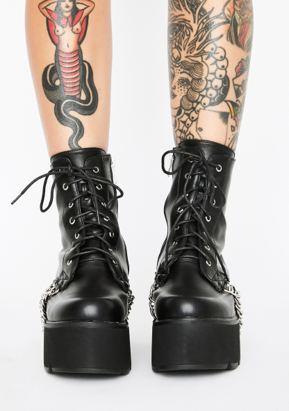 Trapped Platform Boots ya got your enemies locked up for good! Reign over ‘em in these bad AF platform boots that have hella chunky treaded soles, adjustable lace-ups, inside zip closures N’ sikk platinum chains.