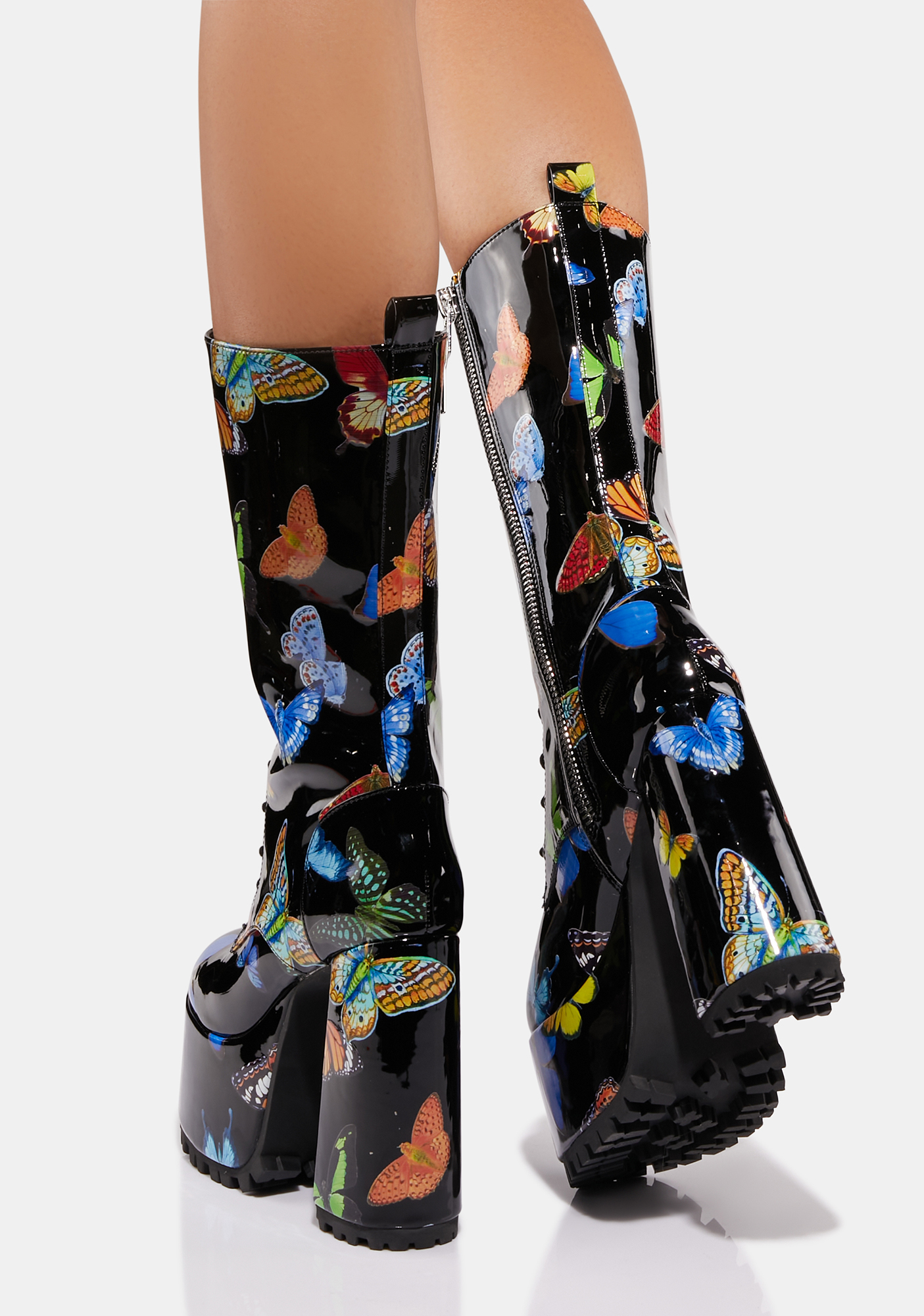 Whisper It Butterfly Print Boots because you’re killing me softly. These boots have a patent vegan leather construction, a platform treaded sole and chunky heel, a mid calf rise, a lace up in front, a zipper closure at the side, butterfly decals in back, and a multicolored butterfly print all over.