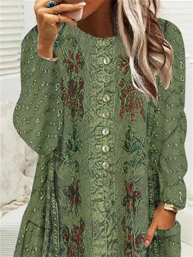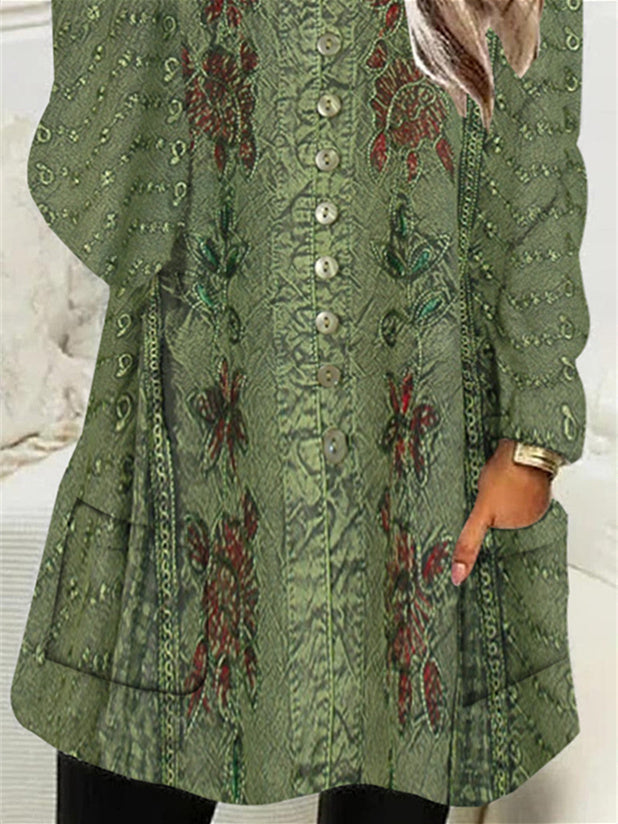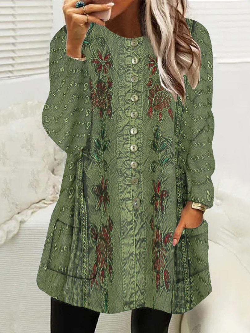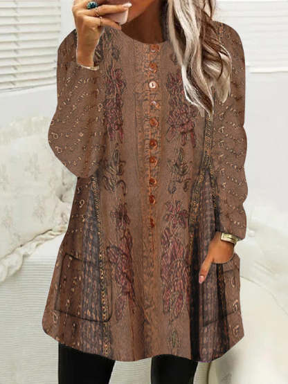 Women Long Sleeve Scoop Neck Printed Button Pockets Fleece Lined Tops