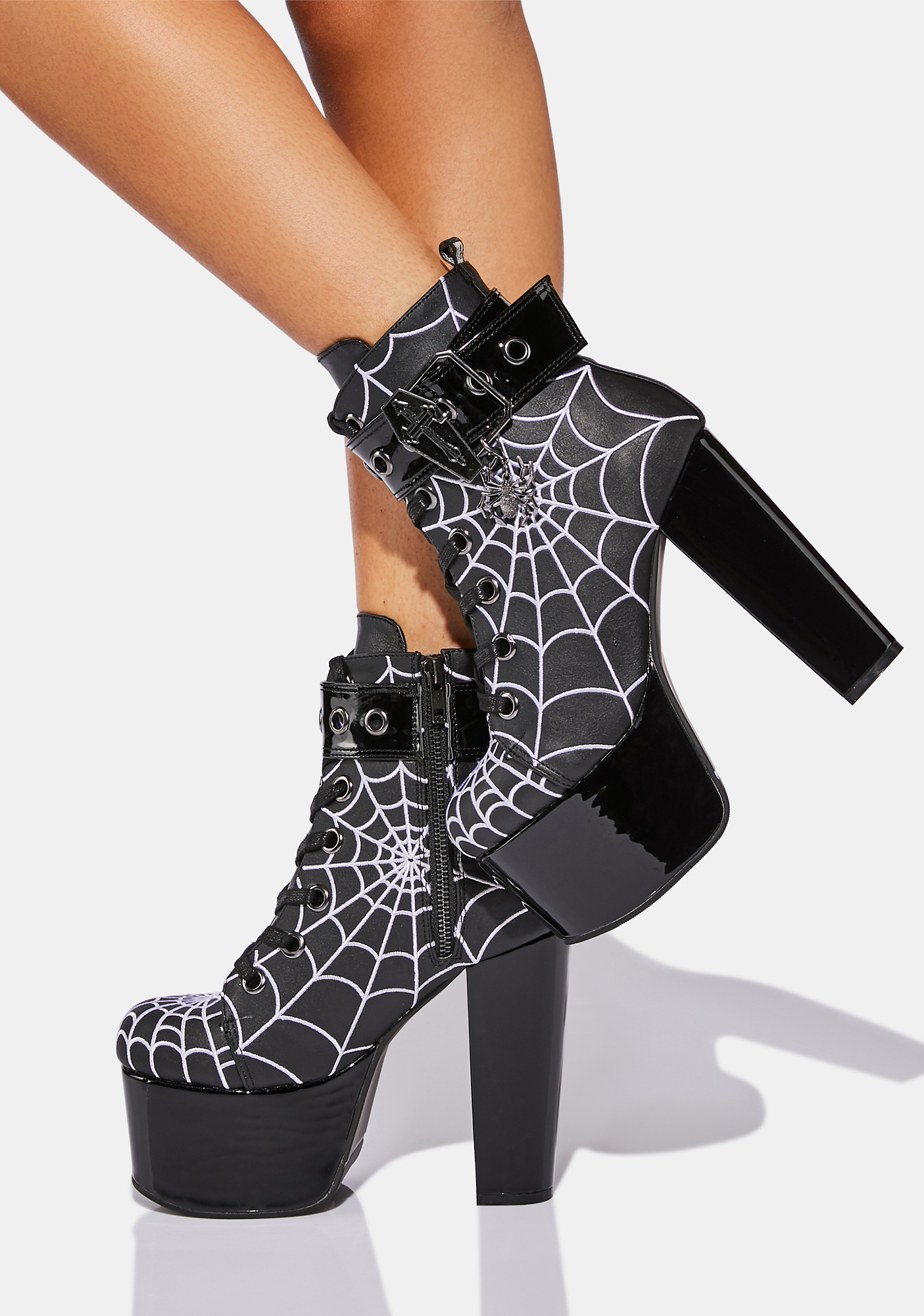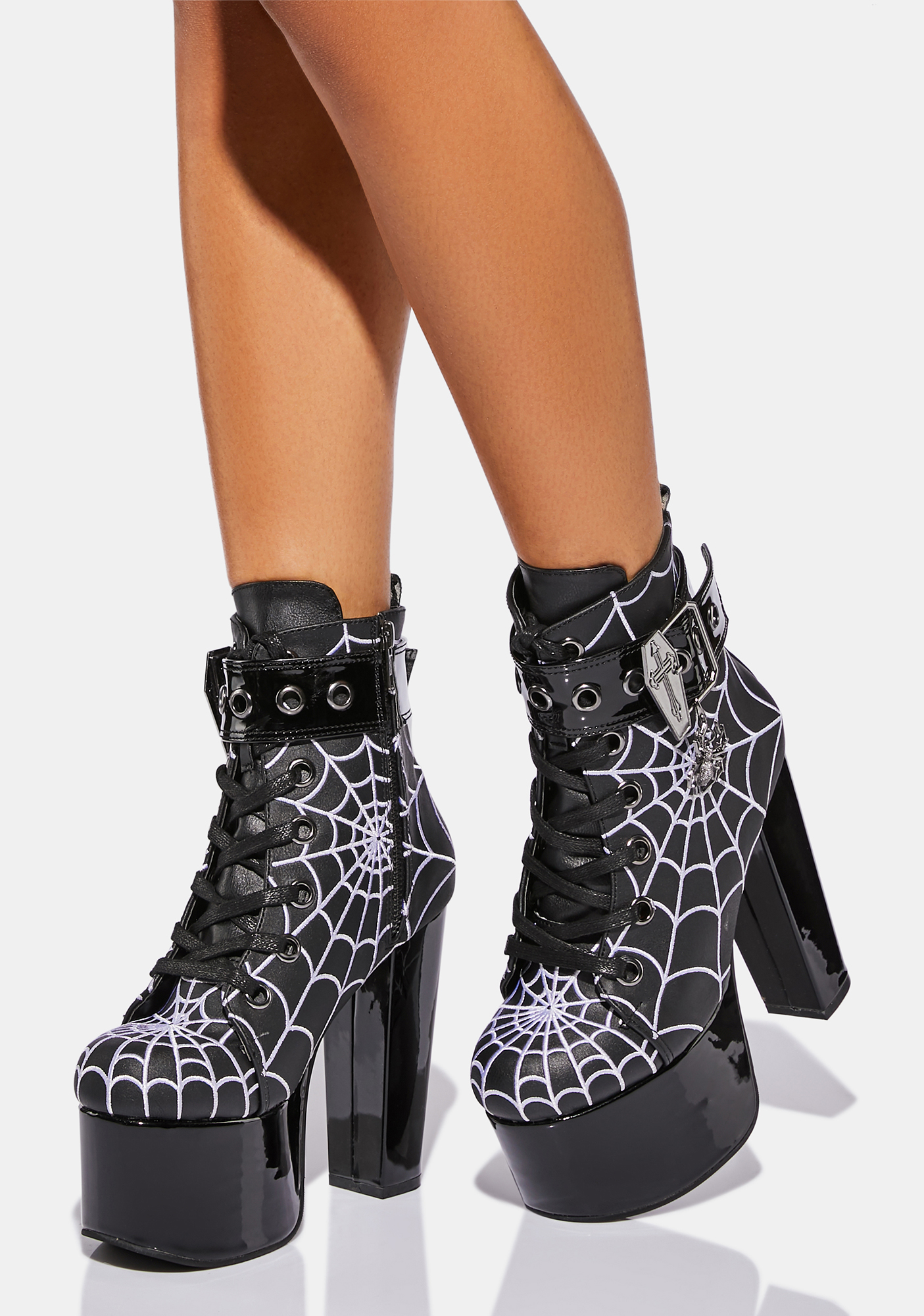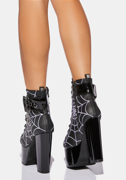 Woven Webs Platform Boots have a vegan leather construction with embroidered black light reactive spider web designs, shiny patent heeled platform soles, wrap buckle straps with coffins and spider charms, adjustable laces, and side zip closures.